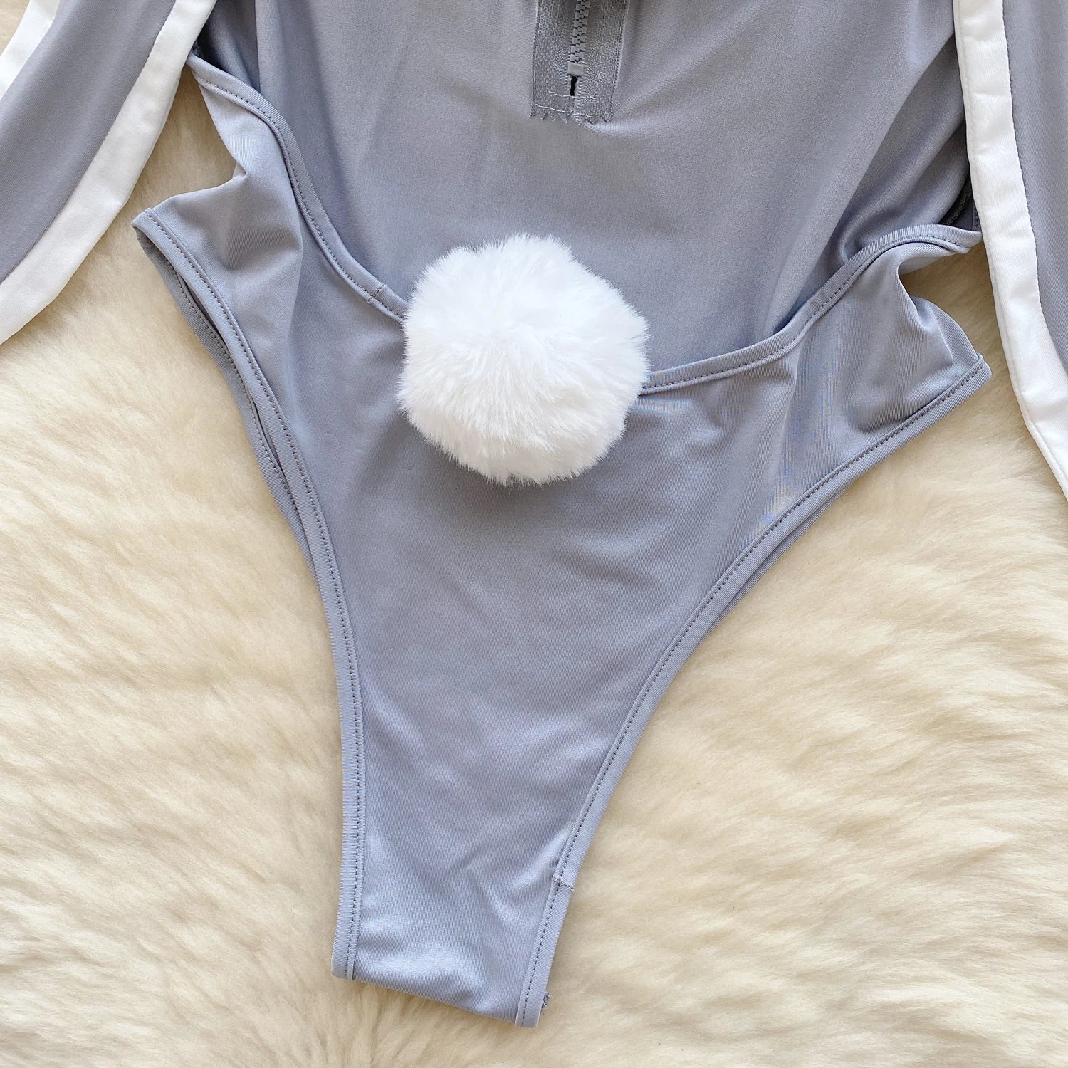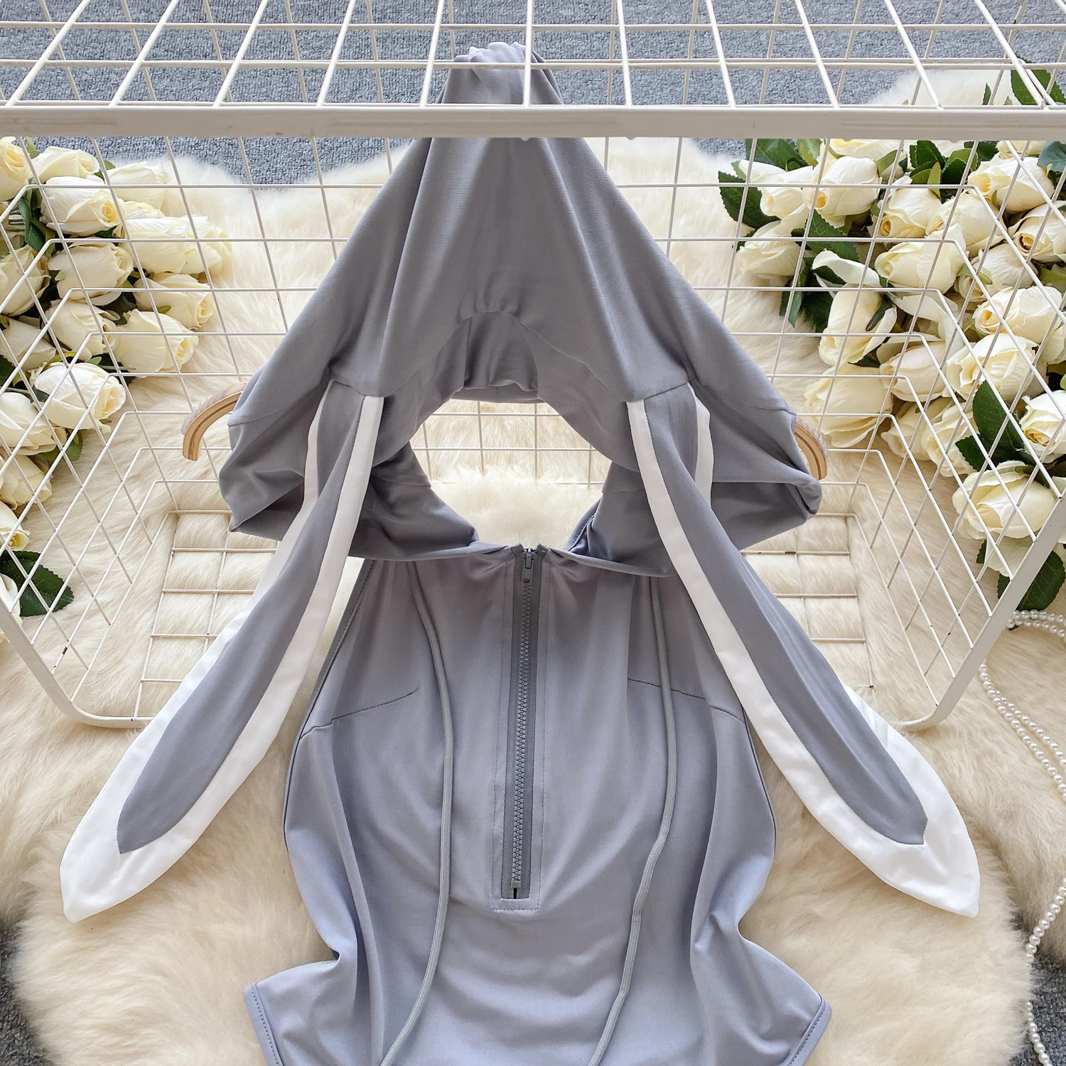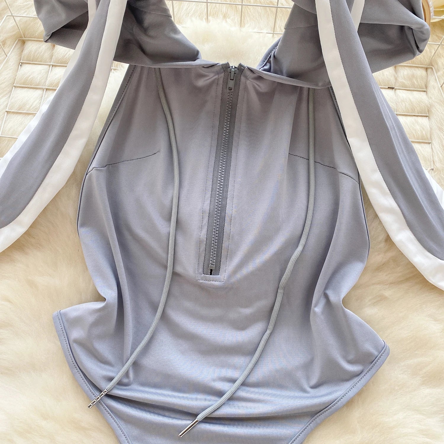 Cute Gray Rabbit Ear Hood Top Sexy Backless Slim Fit Bodysuit Zip Sleeveless Women Sexy Erotic Lingerie Bunny Cosplay Playsuit
