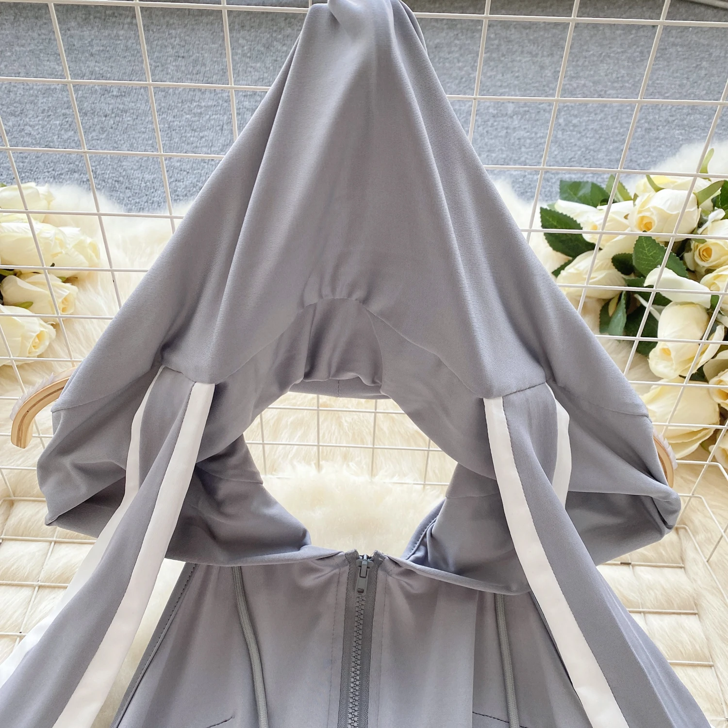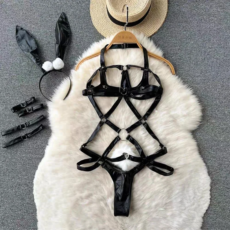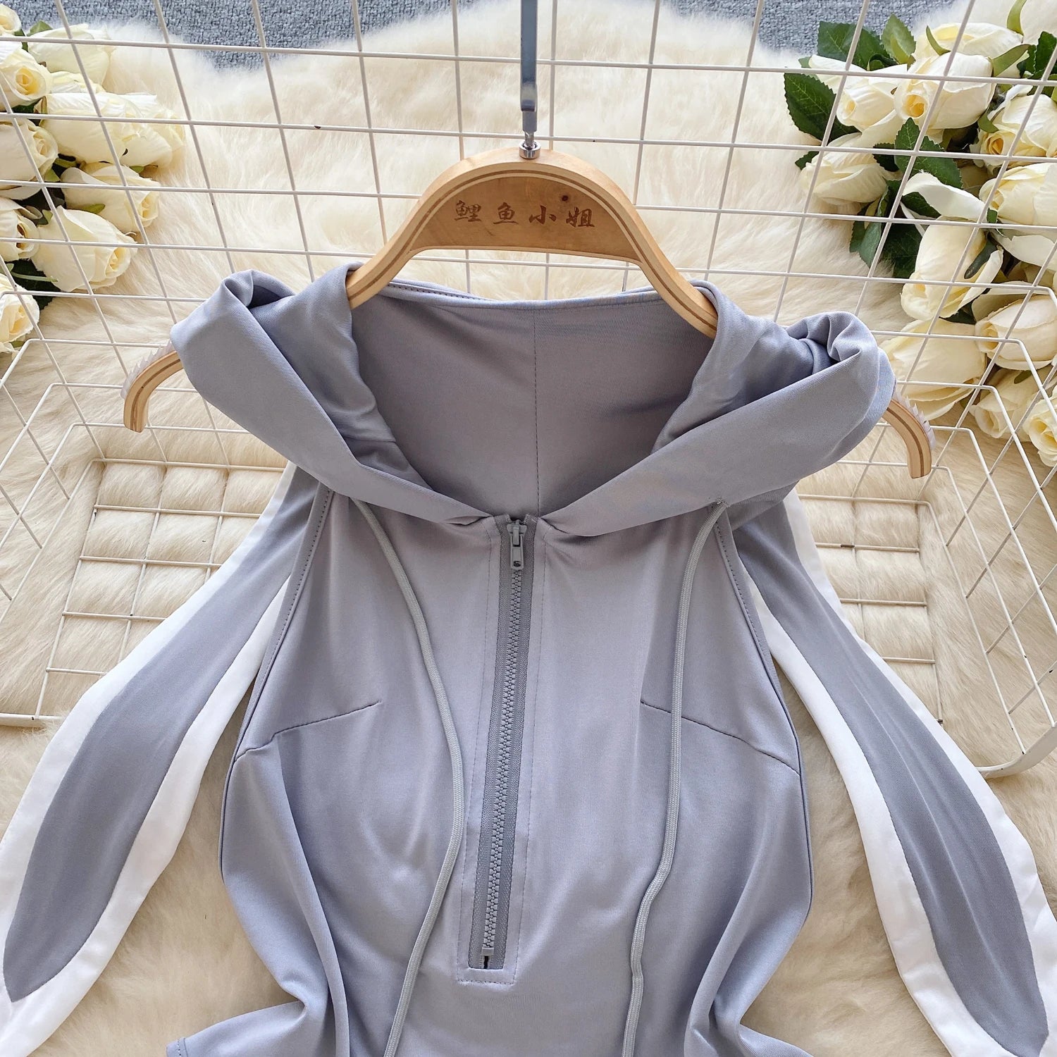 Cute Gray Rabbit Ear Hood Top Sexy Backless Slim Fit Bodysuit Zip Sleeveless Women Sexy Erotic Lingerie Bunny Cosplay Playsuit