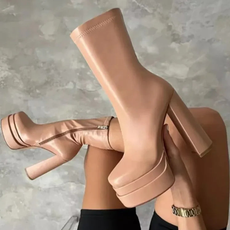 Luxury autumn/winter new double waterproof platform leather thick heel ankle boots women's large size high-heeled women's boots