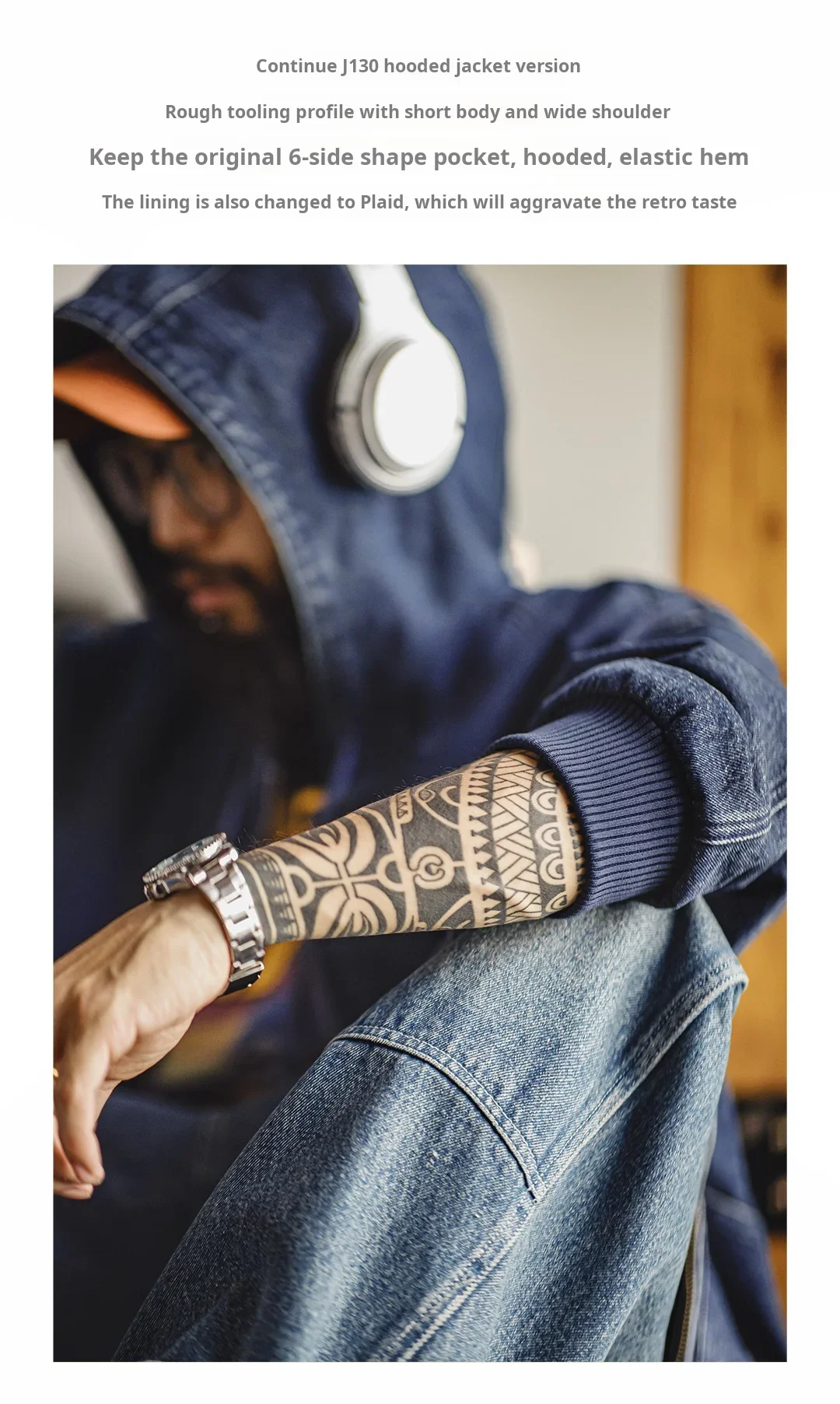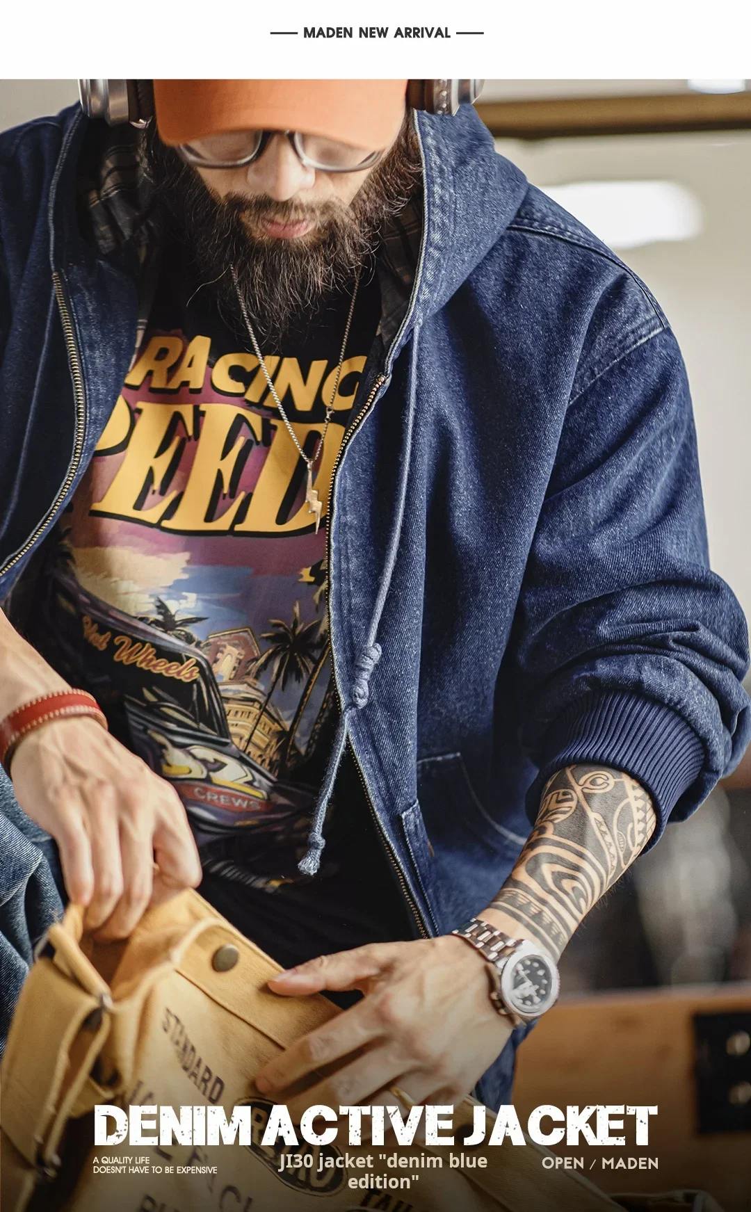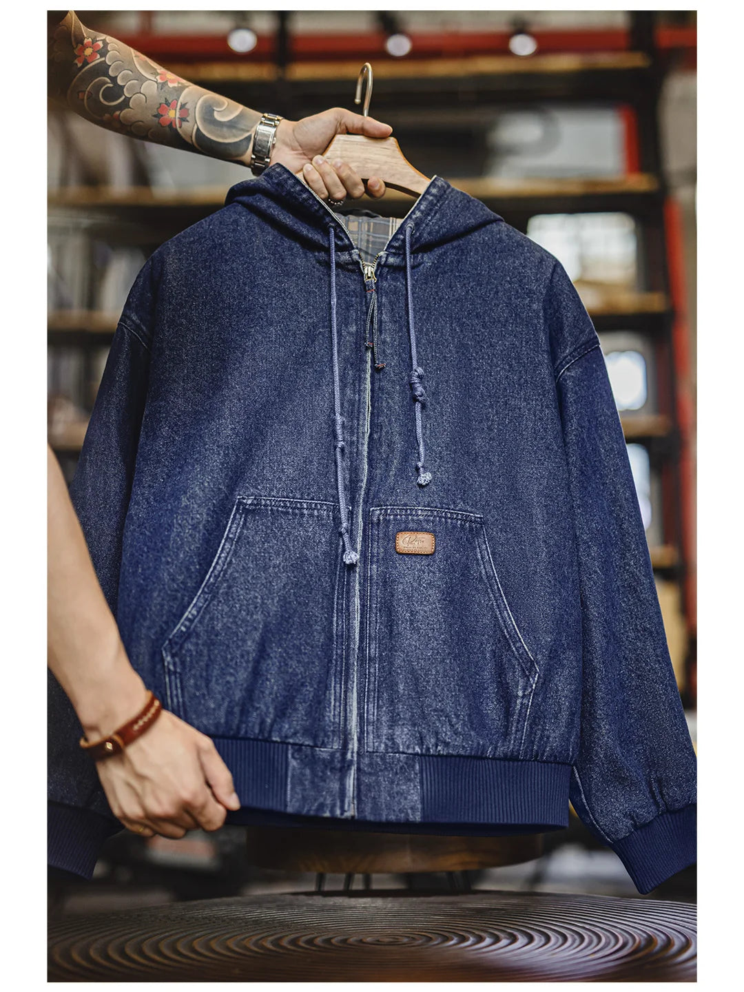Maden Men's Retro J130 10.5oz Denim Jacket Heavyweight Washed Hooded Jacket Regular Fit Zip Workwear Coat with Pockets for Fall