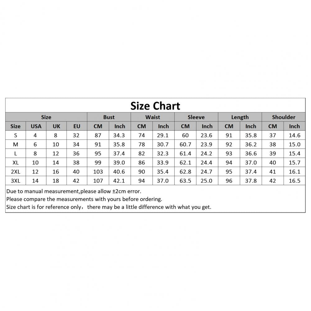 Size: 3XL, Bust: 107cm/42.1", Sleeve: 63.5cm/25", Length: 96cm/37.8", Shoulder: 42cm/16.5", Waist: 94cm/37" (Approx.)
