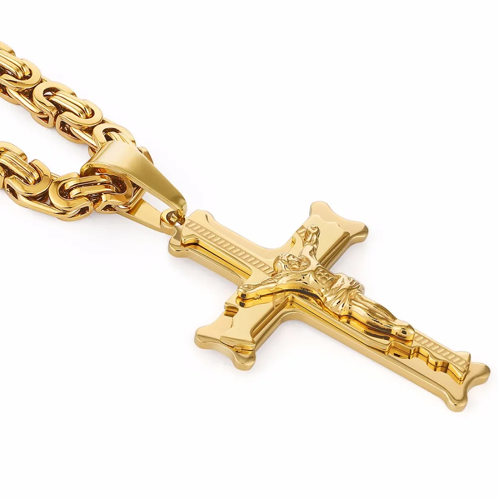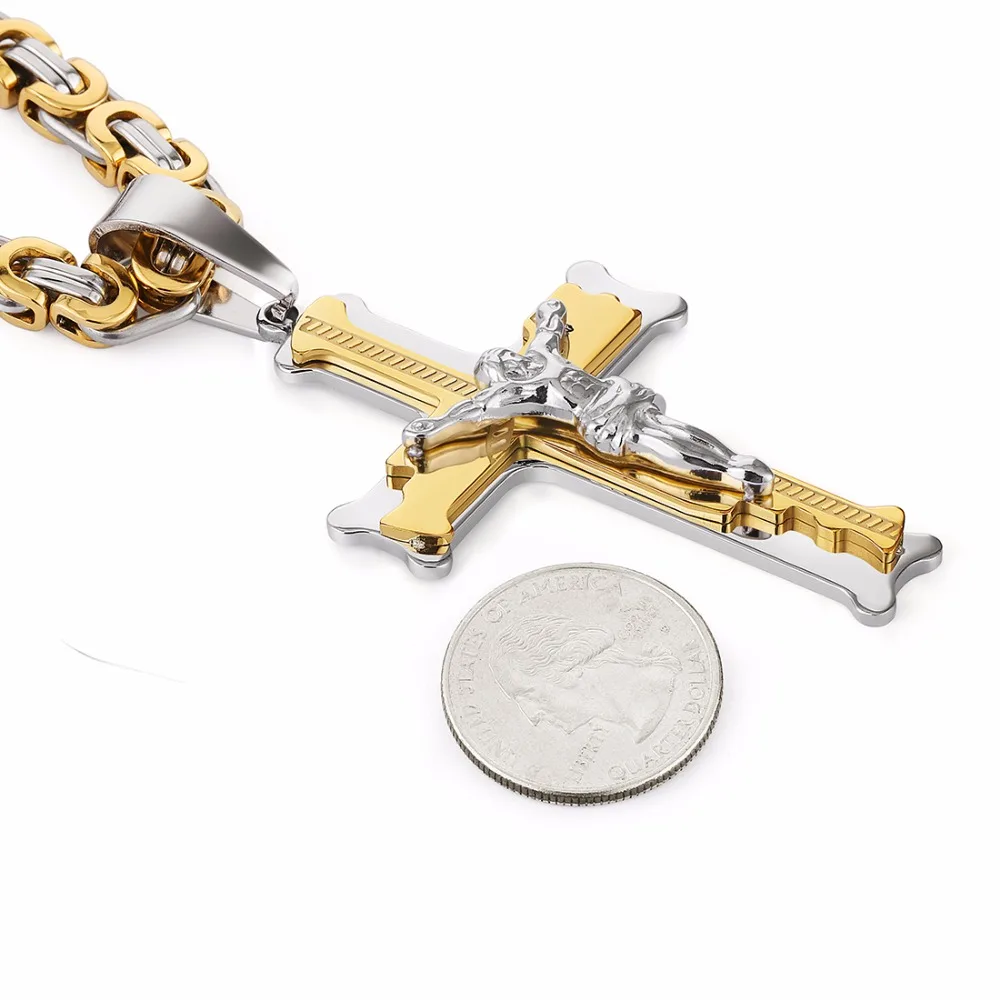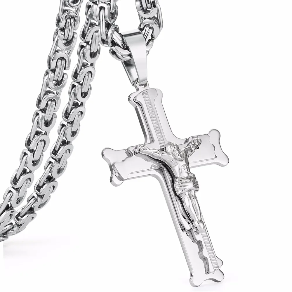 Stainless Steel Christs Jesus Cross Pendant Necklace Link Byzantine Chain Silver Color Necklaces for Men 21.65" 6mm MN50