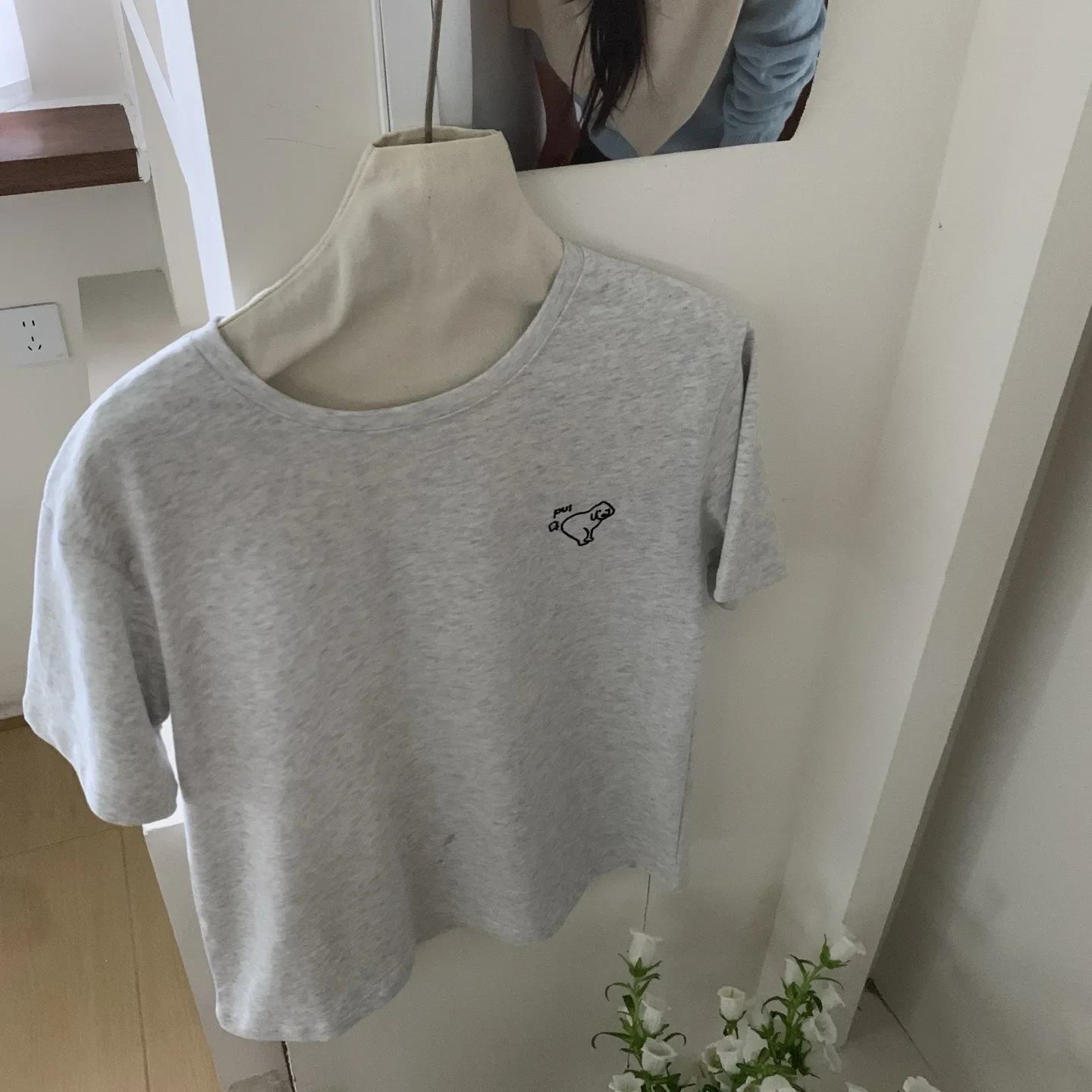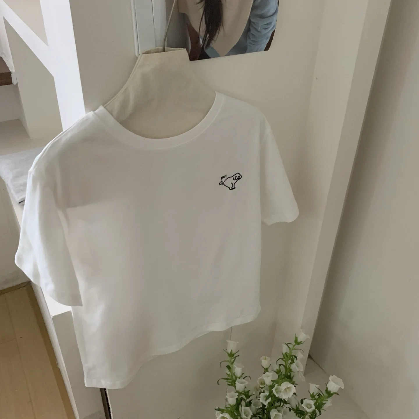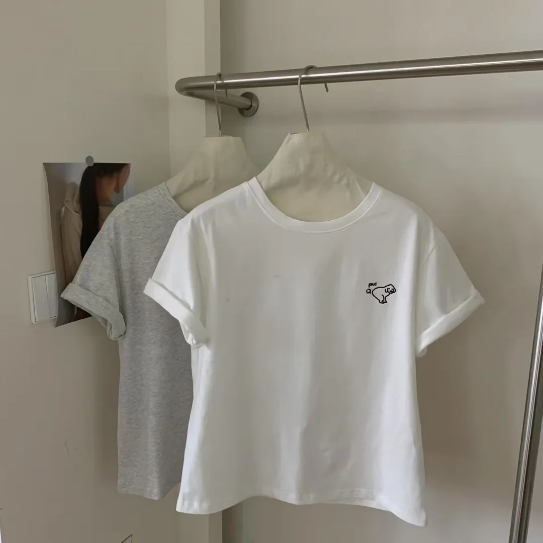 Summer New Korean Style Loose Casual round Neck Short Sleeve T-Shirt Women's White Top Embroidered Dog Pattern Cotton