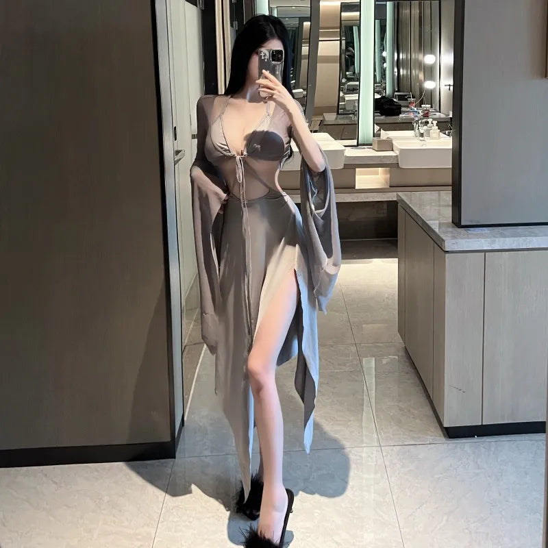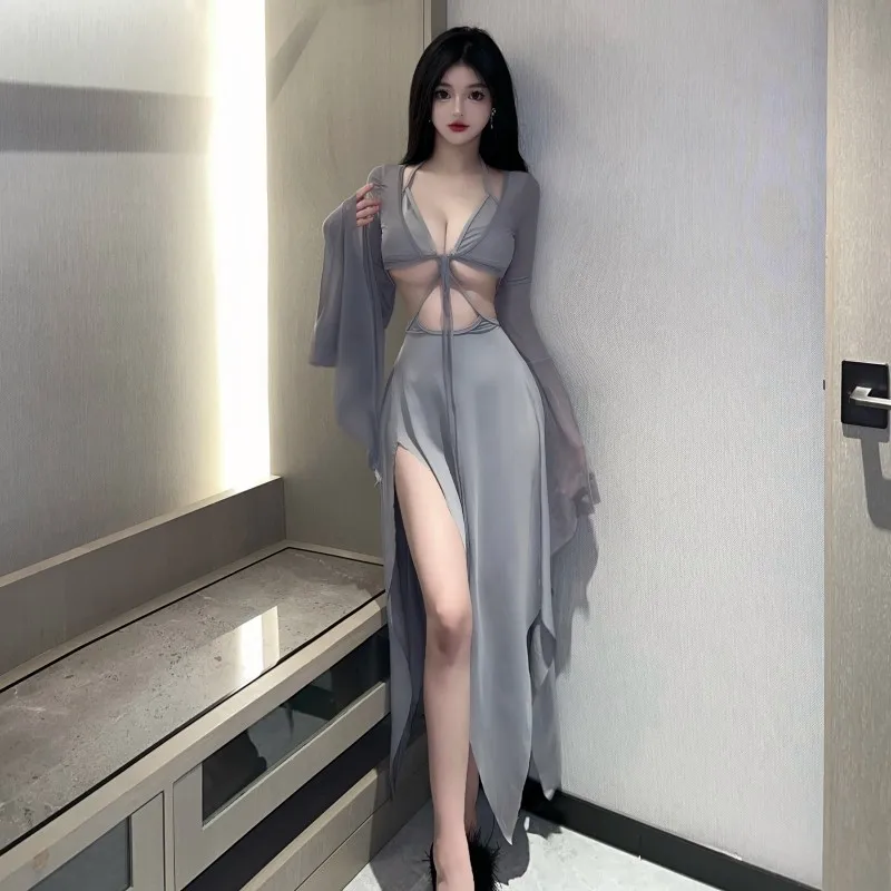 WOMENGAGA Gray Fairy Dress Robe Bandage V Neck Sexy Spicy Girl Beach Resort Long Dress Elegant Auutmn Fashion Women Tops Z8QN